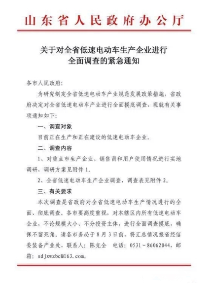 為了規(guī)范低速電動車產(chǎn)業(yè),制定產(chǎn)業(yè)政策,山東省政府決定對全省低速電動車進行摸底調(diào)查,于7月27日發(fā)布了《關(guān)于對全省低速電動車生產(chǎn)企業(yè)進行全面調(diào)查的緊急通知》,對山東省內(nèi)的生產(chǎn)企業(yè)不論規(guī)模大小及投資主體,進行全面的摸底調(diào)查。