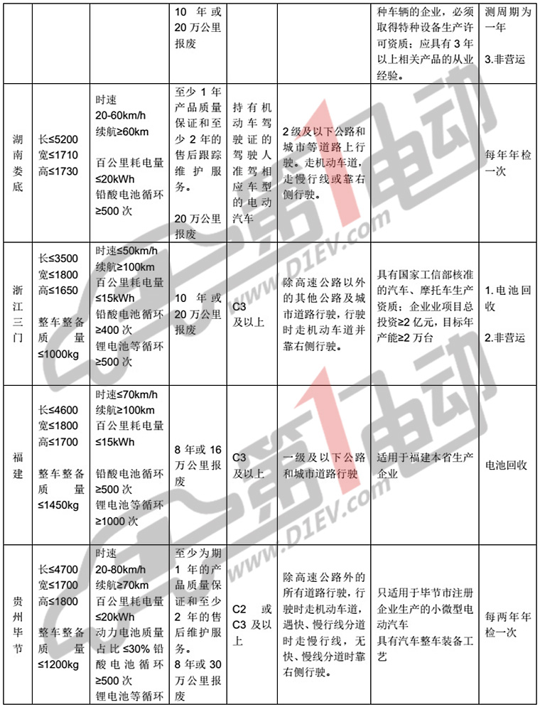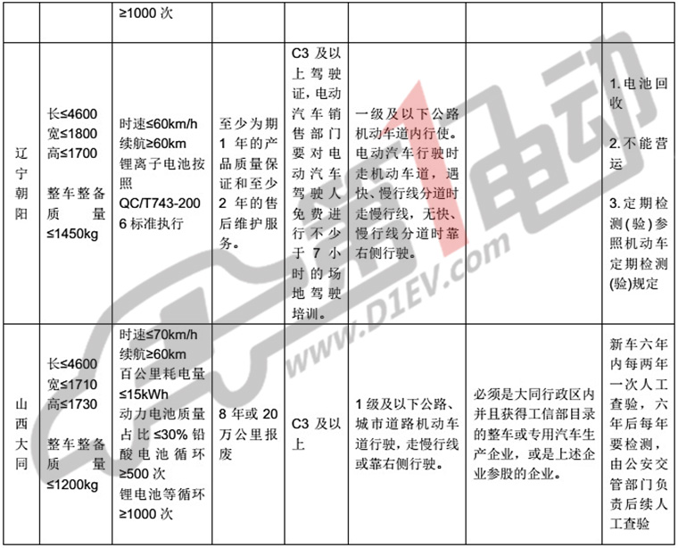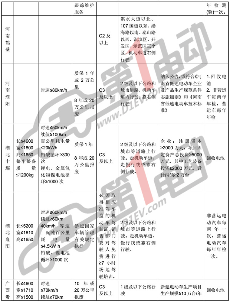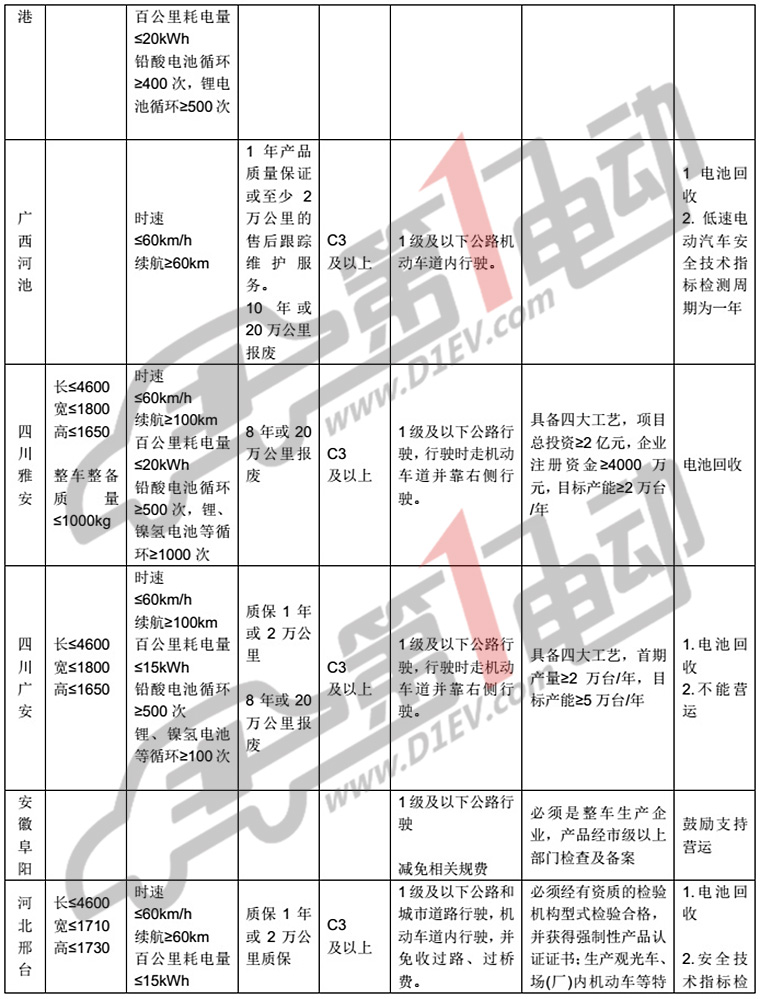 分析總結(jié)已出臺(tái)的地方管理政策,各地對(duì)低速電動(dòng)車(chē)的管理越來(lái)越嚴(yán)格,全面。對(duì)企業(yè)的備案管理中,越來(lái)越多的城市提出了制造工藝、投資規(guī)模、產(chǎn)能規(guī)模、資質(zhì)等方面要求。對(duì)于產(chǎn)品方面,各地對(duì)時(shí)速、續(xù)航、尺寸大小的要求不盡相同,縱觀目前市場(chǎng)上主流的低速電動(dòng)車(chē)產(chǎn)品,大多能滿(mǎn)足這些要求。有一定難度的在于百公里能耗及電池循環(huán)次數(shù)。高如湖北襄陽(yáng)要求鉛酸電池循環(huán)次數(shù)不低于1000,其他城市大多數(shù)要求循環(huán)次數(shù)不低于500次。年檢、質(zhì)保、報(bào)廢期的要求也能規(guī)范產(chǎn)品安全。在駕照方面,絕大多數(shù)城市要求的是C3牌照,山東聊城、河南商丘等少數(shù)城市要求C2牌照。路權(quán)方面,“一級(jí)及以下公路(城市)道路行駛”的規(guī)定居多,少數(shù)要求二級(jí)及以下。