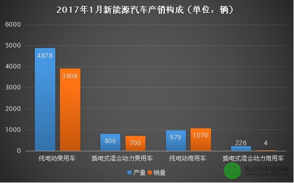 2017年1月新能源商用車產(chǎn)銷嚴重下跌,銷售主力是新能源乘用車