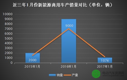 從上圖可以清晰的看到,無論是從產(chǎn)量還是銷量上,2017年1月份的數(shù)據(jù)都要比前兩年的數(shù)據(jù)低,其中銷量數(shù)據(jù)明顯。2015年1月新能源商用車銷售2000輛,2016年1月新能源商用車銷售9000輛,而2017年1月新能源商用車僅銷1074輛。