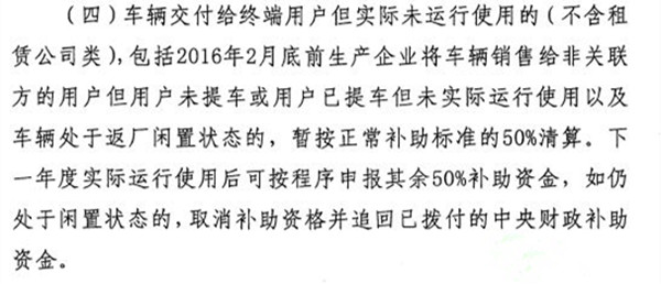 據(jù)此可以推測(cè),近日流傳出的“閑置車(chē)輛信息參考表”即為2016年9月專(zhuān)員辦檢查及各地方政府復(fù)查出的“閑置車(chē)輛”信息匯總。此番再次發(fā)布《關(guān)于報(bào)送2015年度新能源汽車(chē)閑置車(chē)輛情況的通知》,是要求對(duì)認(rèn)定為閑置情形的車(chē)輛運(yùn)行情況進(jìn)行核查確認(rèn)。而后,四部委會(huì)根據(jù)反饋信息形成終關(guān)于“閑置車(chē)輛”問(wèn)題的確定,并按照出售對(duì)象是關(guān)聯(lián)企業(yè)而非終端用戶(hù)且閑置的車(chē)輛不予以清算,對(duì)出售給非關(guān)聯(lián)用戶(hù)但處于閑置狀態(tài)的車(chē)輛按正常補(bǔ)助的50%進(jìn)行清算。